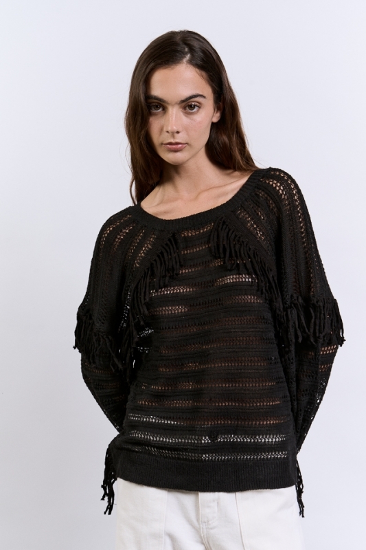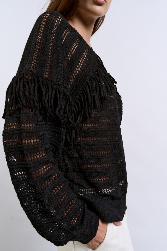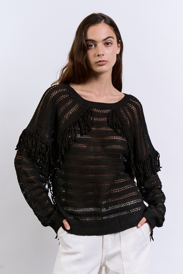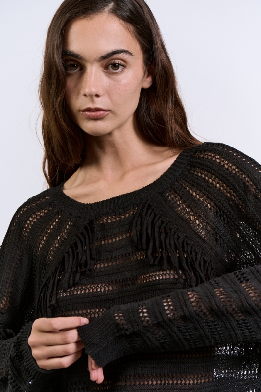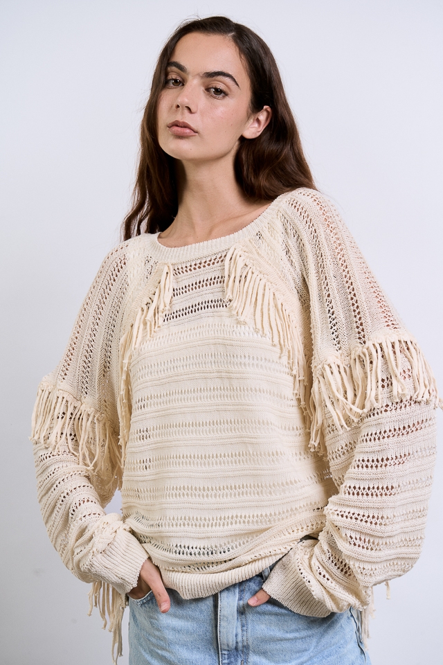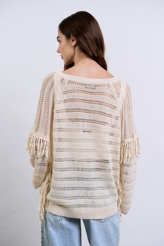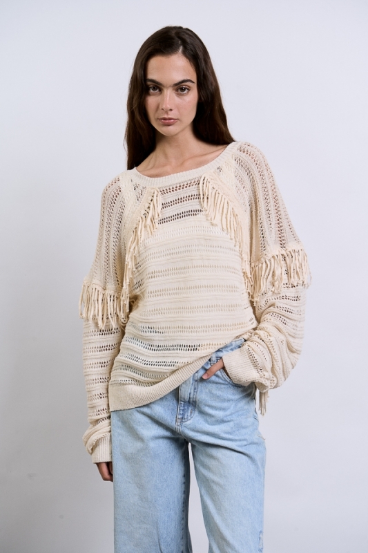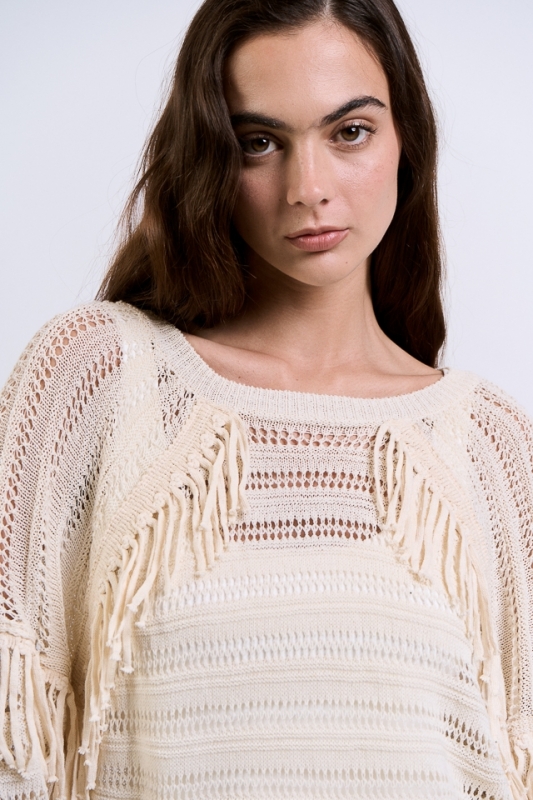 Sweater tejido con punto semiabierto de diseño acanalado horizontal. Presenta recortes en mangas con detalles de flecos. Composición: 30% algodón peinado 70% poliéster ondulado regenerado HECHO EN CHINA