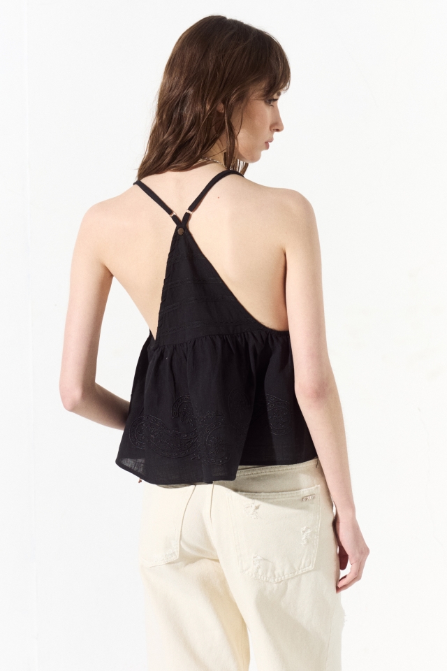 Top confeccionado en voile de algodón con broderie, de corte en busto y amplitud en zona inferior. Además tiene grifa metálica con identificación de marca grabada. Composición: 100% algodón HECHO EN CHINA