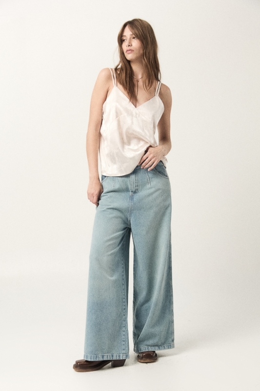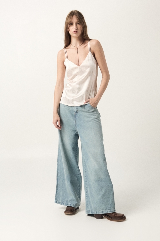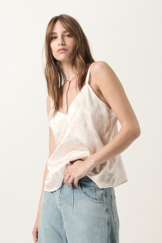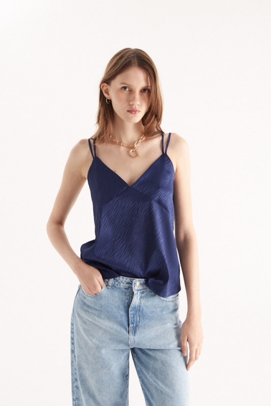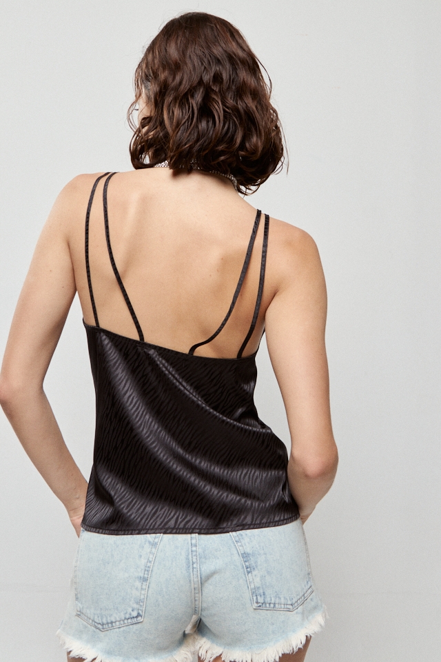Top de saten jacquard. Detalle de bretel doble.