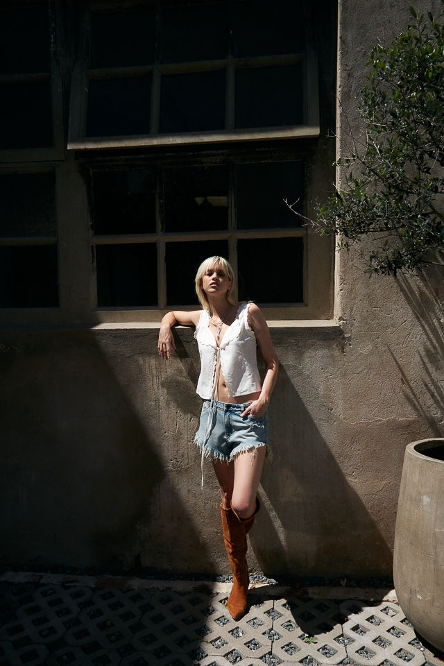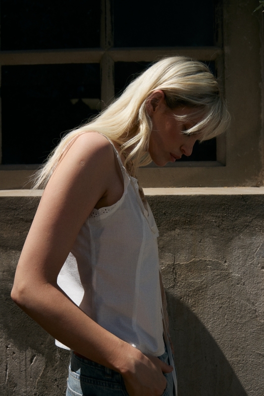 Top tipo chaleco con puntillas en borde de sisa y abertura. Cierre por lazo delantero
