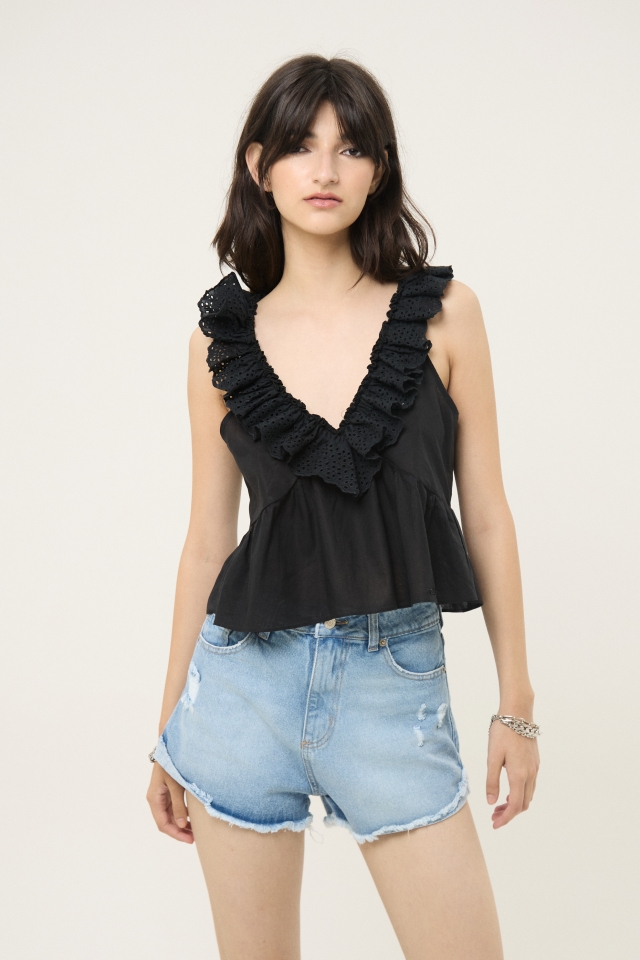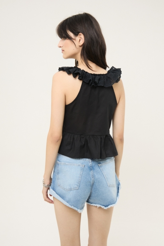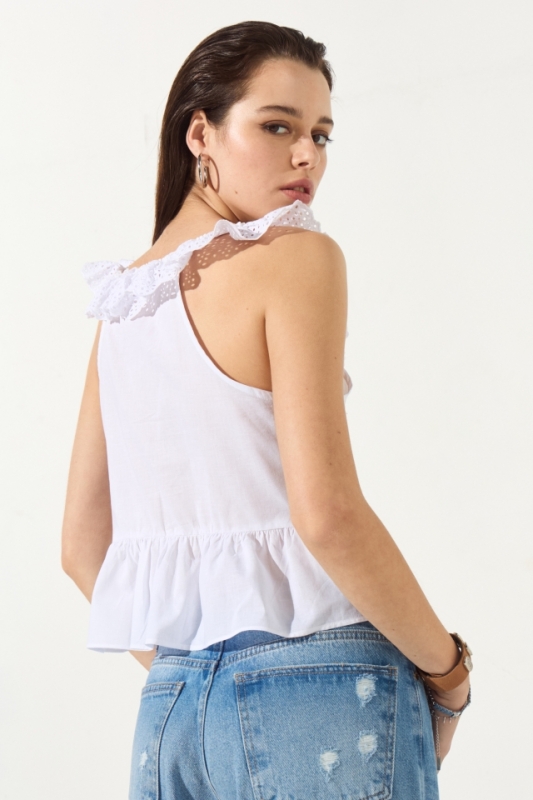 Blusa escote en V y detalle de puntilla con volado en cinturaComposición: 100% algodón
