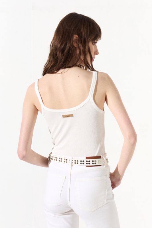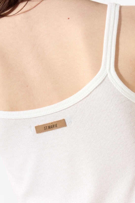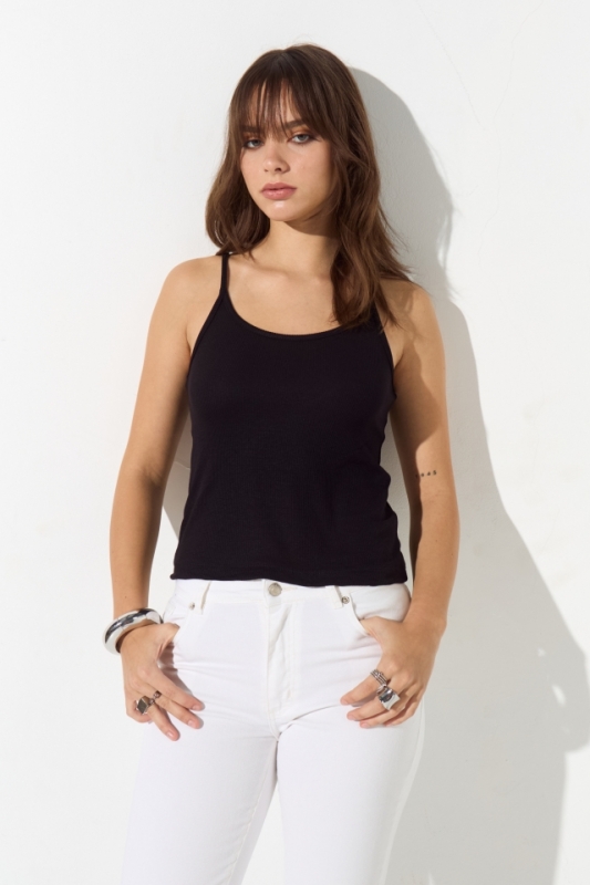 Top de morley viscosa, con breteles finos realizados en la misma tela base. En el centro de la espalda cuenta con una badana que lleva la inscripción de la marca. Composición: 95% Rayon 5% Spandex