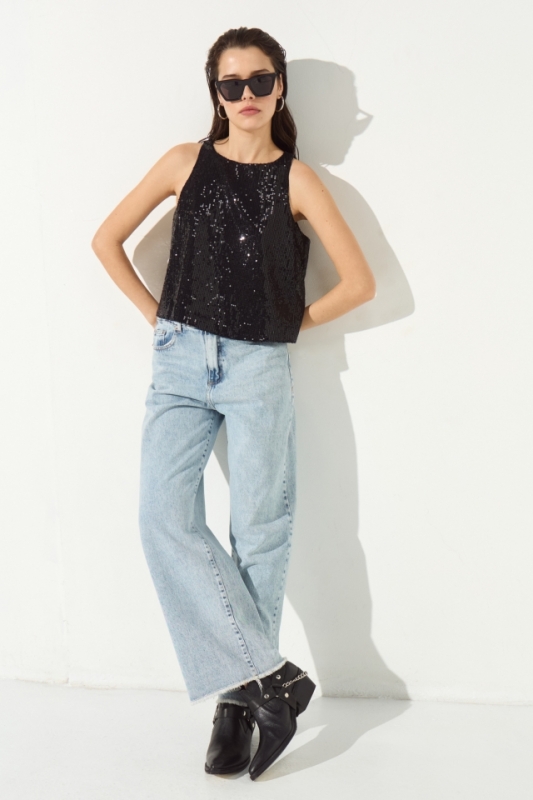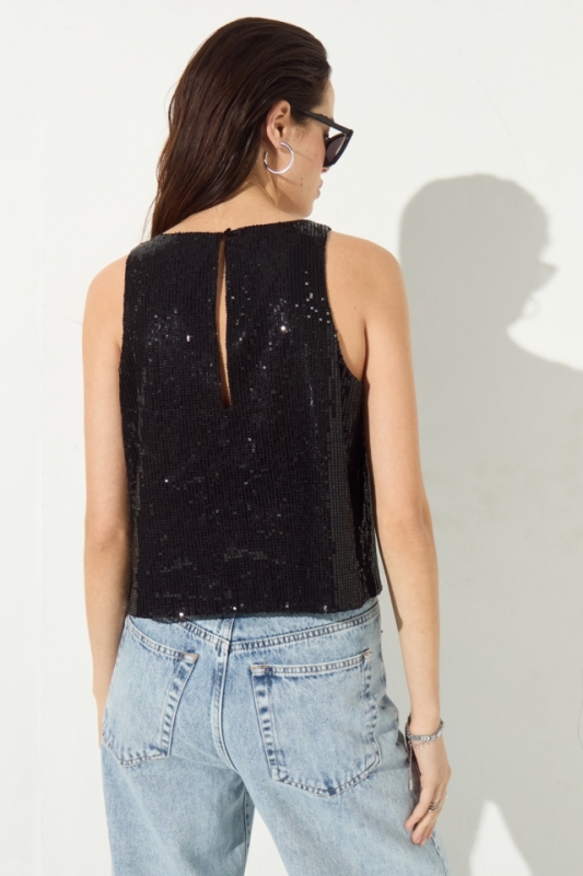 Top corto de lentejuelas, con escote bote y acceso con ojal y botón en centro espalda.
