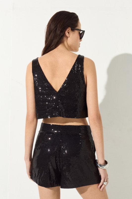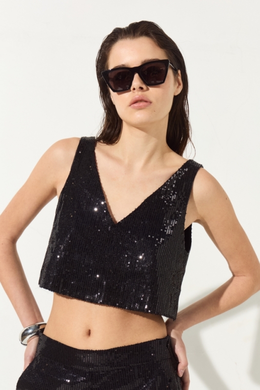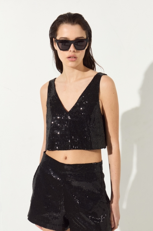 Top corto de lentejuelas. Tiene escote V y anchos breteles. Ademas lleva grifa metálica con identificación de marca grabada. Composición: 95% poliester 5% spandex FORRERÍA: 95% poliester 5% spandex HECHO EN CHINA