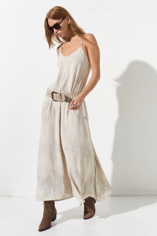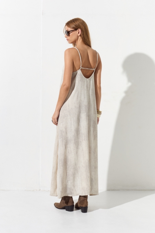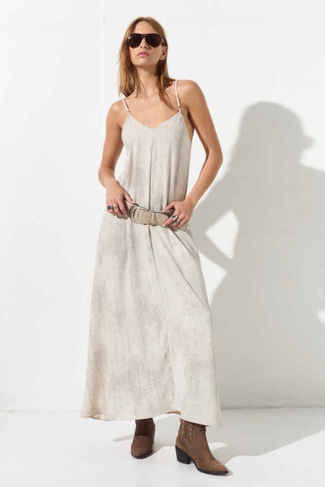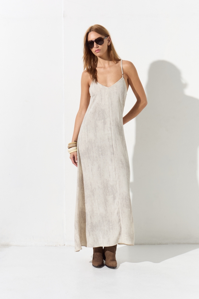 Vestido largo confeccionado en seda marmolada, de escote V con breteles elásticos y amplitud en zona inferior.Composición: 100% poliéster