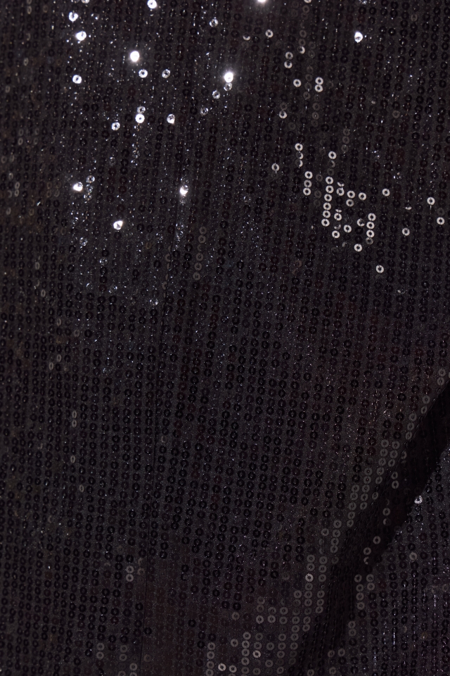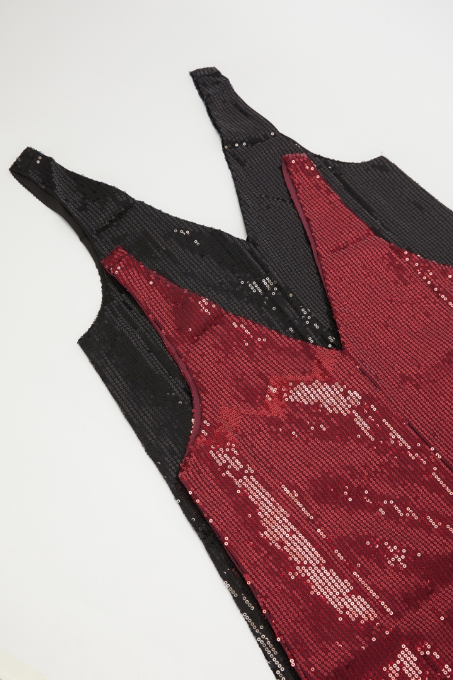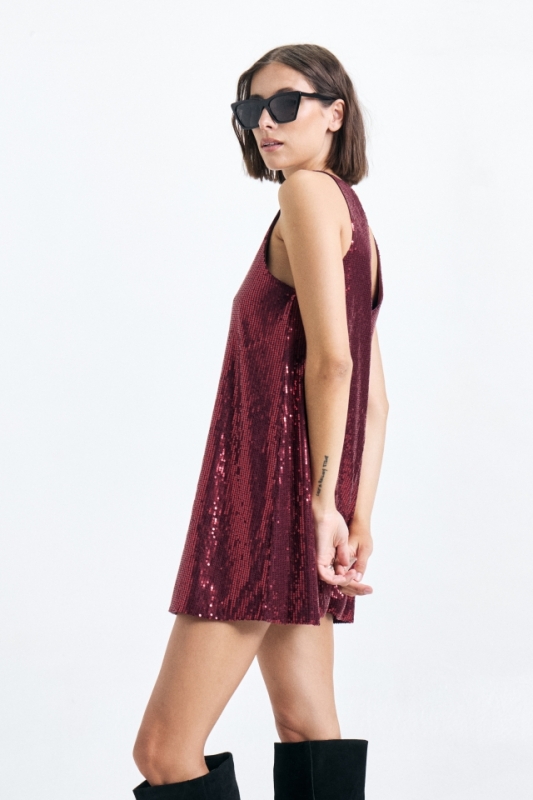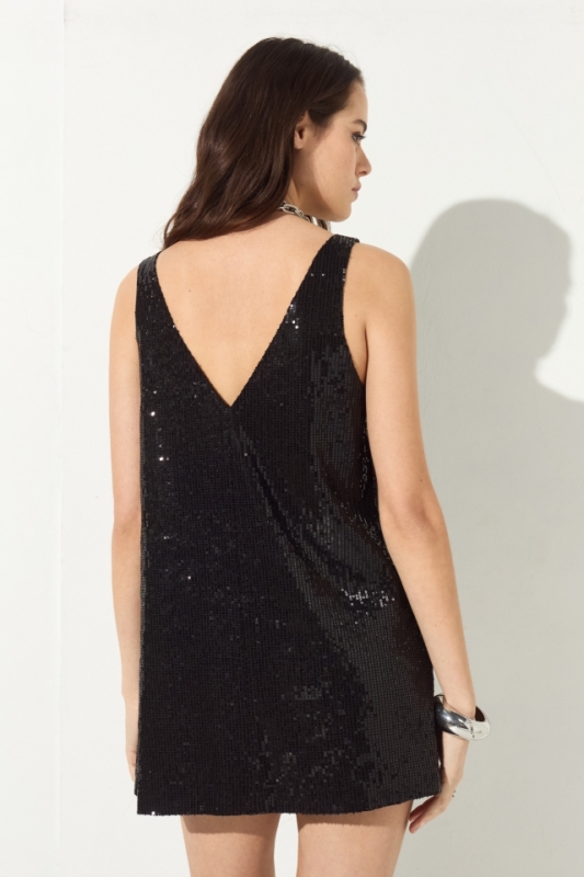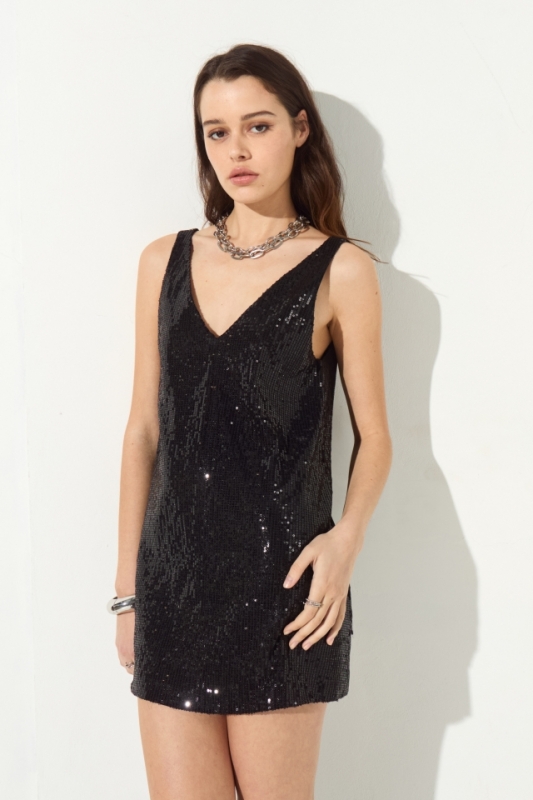 Vestido corto de lentejuelas. Tiene escote V y anchos breteles. Ademas lleva grifa metálica con identificación de marca grabada. Composición: 95% poliester 5% spandex FORRERÍA: 95% poliester 5% spandex HECHO EN CHINA