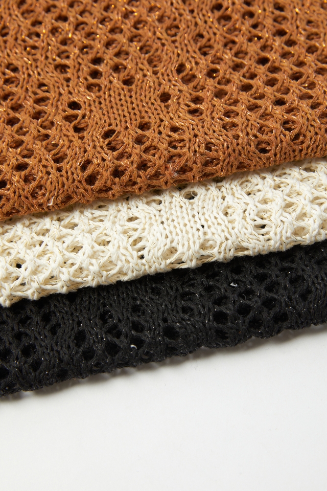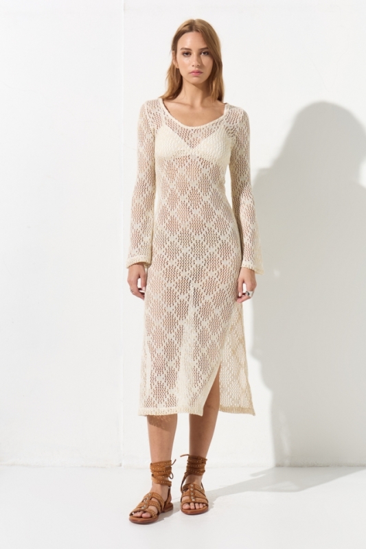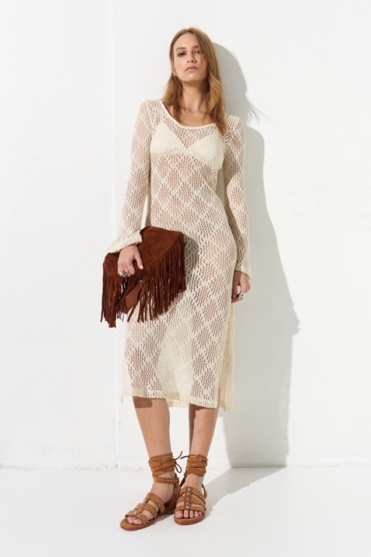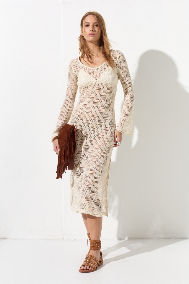 Vestido playero largo, en tela crochet, con escote cavado y tajos laterales . Lleva etiqueta rústica en centro superior de espalda. Composición - 71% Poliéster 27% Cotton 2% lúrex
