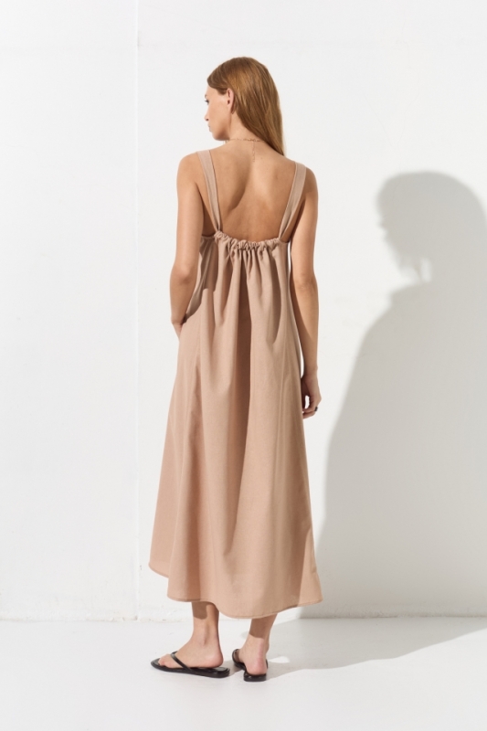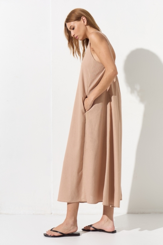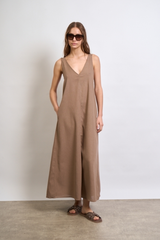 Vestido de lino con recortes, posee un escote en v, su largo es hasta el tobillo y lleva un ajuste en espalda, cuenta además con bolsillos laterales. A modo de detalle en su espalda se le colocó una chapita con la identificación de marca.